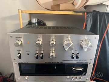Nonostante sia il modello d'ingresso della serie (che include anche il SA-606 e il SA-706), offre prestazioni solide per ambienti di medie dimensioni. Potenza: 25 watt per canale su 8Ω (RMS). Risposta in frequenza: Da 20Hz a 40kHz. Distorsione Armonica Totale (THD): 0,08%. Rapporto Segnale/Rumore: 92dB (linea), 76dB (phono MM). Fattore di smorzamento (Damping Factor): 30. Peso: 5,9 kg. YouTube YouTube +8 ✨ Caratteristiche Distintive casse Design Classico: Pannello frontale in alluminio spazzolato con manopole e levette robuste. Subwoofer Sezione Phono Avanzata: Utilizza un nuovo circuito kef integrato che garantisce un'eccellente precisione della curva RIAA (±0,5 dB). Denon VU-Meter: Due grandi indicatori a lancetta illuminati che mostrano la potenza d'uscita in tempo reale. Sansui Connettività: Dispone di ingressi per Giradischi (Phono), Tuner, Aux e Tape. Permette il collegamento di due coppie di diffusori (A e B). Stereo