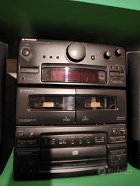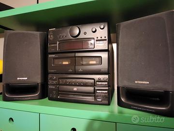 Pioneer XR-P330 Stereo CD Cassette Deck Receiver. In buone condizioni estetiche. La radio funziona. Casse/altoparlanti perfettamente funzionanti. Non legge le cassette e i cd. Ha problemi nella rilevazione di questi. Il mangiacassette di sinistra si apre con qualche difficoltà. Sono inclusi: telecomando originale, antenna fm, antenna am e manuale d'istruzioni.