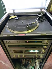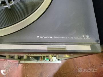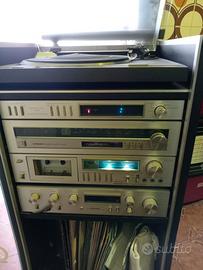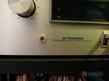 sistema Hi-Fi vintage Pioneer, parte della celebre serie "Blue Line" prodotta intorno al 1980. Componenti:Il set include un amplificatore stereo integrato, un sintonizzatore radio (tuner) e una piastra a cassette (cassettera) impilati verticalmente. Caratteristiche:È riconoscibile per i vu-meter fluorescenti di colore blu e le finiture in alluminio spazzolato, tipici di questa linea. Modelli: l'amplificatore SA-510, il sintonizzatore TX-410 o TX-710, e la piastra TC-300.