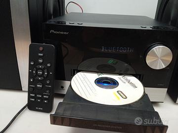 Marca PIONEER modello X-PM12 microsistema da 30W + 30W RMS con sintonizzatore FM, lettore CD , USB, Aux-in e BLUETOOTH per collegare virtualmente qualsiasi dispositivo per lo streaming audio wireless. Telecomando. Coppia di diffusori 2x38watt a 2vie bass-reflex woofer da 90mm tweeter da 50mm radiatore passivo da 120mm. Dimensioni unità principale: 230x150x248 mm. Diffusori: 140x290x277mm. Altri dati disponibili in rete.
