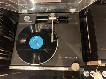 Pioneer PL-L1000 — Giradischi Direct Drive a Lettura Lineare Il Pioneer PL-L1000 è uno dei giradischi più sofisticati mai prodotti dalla casa giapponese, frutto dell’era d’oro dell’hi-fi analogico dei primi anni ‘80. Un progetto ambizioso che unisce trasmissione a trazione diretta, braccio a inseguimento lineare e automazione completa in un’unica macchina di straordinaria precisione. Braccio a Inseguimento Lineare Il cuore del PL-L1000 è il suo braccio tangenziale a motore lineare, che riproduce esattamente il percorso della testina di taglio originale del master. Il risultato è l’eliminazione totale dell’errore di tracking, assenza di forza centripeta, distorsione armonica e di intermodulazione ridotte al minimo, immagine stereo stabile e precisa lungo tutto il disco — dalla prima all’ultima traccia. Motore Direct Drive al Quarzo Il motore brushless con controllo PLL al quarzo garantisce una stabilità di velocità eccezionale, con wow & flutter inferiore a 0,013% WRMS e rapporto segnale/rumore superiore a 78dB. Il piatto da 310mm in lega di alluminio pressofuso assicura inerzia costante e rotazione silenziosa. Automazione Completa Il PL-L1000 offre un sistema di controllo avanzato con funzioni auto lead-in, auto-return, auto cut, quick repeat, quick play, quick stop, lettura diretta della pressione di tracking, regolazione altezza braccio e dispositivo di cueing. Tutto gestibile con i pratici comandi soft-touch sul pannello frontale. Costruzione Piatto in alluminio pressofuso da 310mm, sospensione coassiale a molle, plinto in alluminio e base in acciaio, braccio con lunghezza effettiva 190mm e overhang zero. Compatibile con testine da 4 a 24g. Specifiche Tecniche Trasmissione: direct drive al quarzo — Wow & flutter: < 0,013% WRMS — S/N: > 78dB — Piatto: 310mm alluminio — Velocità: 33 e 45 giri — Lunghezza efficace braccio: 190mm — Overhang: zero — Dimensioni: 494 × 154 × 456mm — Peso: 12kg. Perfettamente funzionante. Completo del suo imballo originale.