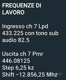 IUR7/Lpd-Pmr, operante su frequenze di libero uso che non necessitano di autorizzazione ministeriale e del canone annuo, come previsto per altri servizi di radiocomunicazione.