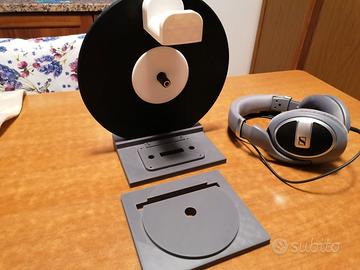 Vendo Porta Cuffie realizzato con stampante 3D in riferimento agli anni 70--80 e al ritorno del vinile pensato con un vinile facente da supporto a cuffia e adattatore e posteriormente regi cavo pezzo che non deve mancare al proprio Hifi con base una cassetta audio o un dischetto audio
