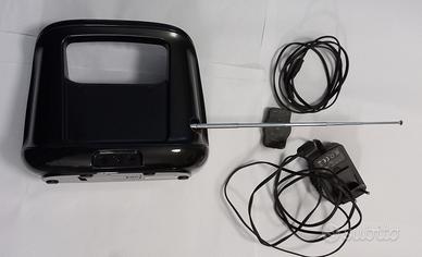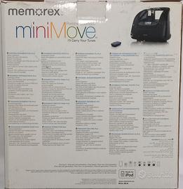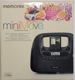 Mini Move Memorex Boombox portatile per iPod, altoparlanti stereo con radio FM digitale con preselezione delle stazioni. Display digitale retroilluminato, consente di alimentare o caricare i di-spositivi iPod con possibilità di collegamento, equalizzatore preimpostato , presa jack Line-on per collegare altri dispositivi audio digitali, viene fornito il cavetto. Utilizza 4 batterie AA (non incluse) per uso senza rete. Viene fornito l'alimentatore per l'uso in sede tramite rete. Il telecomando non funziona ma viene fornito. Per tutti coloro che usano o amano gli storici iPod o anche per collegare e senti-re musica in stereo dal proprio smartphone. In confezione originale. Usato. Vendesi per mancato utilizzo.