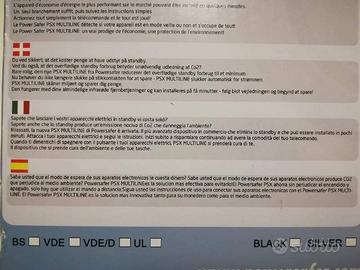 Oltre alla funzione di protezione come parafulmine, lo standby, sebbene alla vista appare solo come una flebile lucina piccolina, non mostra e non dice che all-interno dell-apparecchio l-energia continua a esserci e può arrivare a farci consumare anche il 40% di quando è acceso, annualmente paghiamo di energia elettrica per mantenere accesi dei led di elettrodomestici non utilizzati fino a 75 Euro in più. Ma come funziona? Come si vede dalla foto va posizionato tra la presa elettrica e una ciabatta con massimo 5 apparecchi collegati e tramite il chip in 20 secondi memorizza lo stato elettrico degli apparecchi collegati eliminando l-alimentazione ad essi quando sono in standby. Non necessita di alcuna configurazione. Le operazioni da compiere sono quelle di collegare una ciabatta al PSX, successivamente collegare il PSX alla presa a muro e infine accendere tutti gli apparecchi collegati. A questo punto avrà già memorizzato le informazioni necessarie e tramite un Led verde ci comunicherà che sta funzionando correttamente. La portata ha un massimale di 1000 Watt e il consumo del Powersafer è inferiore a 0,5 W. Inoltre è dotata di protezione -parafulmine- e delle maggiori Certificazioni Internazionali nel campo del risparmio energetico. Ora si starà pensando - carino, utile anche, ma quanto costa?. Il prezzo di questo apparecchio è di circa 30 Euro, dipende da dove lo si acquista, io lo vendo, nuovo mai installato, a metà prezzo.
