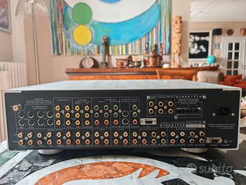 Pre processore AV Audio Analogue Cinecittà usato, in condizioni estetiche e funzionali perfette. È un componente di alta gamma progettato per offrire grande musicalità, precisione e versatilità, adatto sia a sistemi home theater multicanale sia a configurazioni stereo. Garantisce un suono pulito e dettagliato sia su due che su sei canali, con un’elevata qualità di riproduzione e facile integrazione in qualsiasi impianto grazie al design elegante. La circuitazione analogica utilizza componenti discreti, ampia banda passante e bassa controreazione, assicurando trasparenza e fedeltà. Integra un amplificatore phono MM/MC e impiega componenti passivi di altissima qualità, come resistenze a bassa tolleranza e condensatori selezionati per ridurre perdite e distorsioni. Il controllo del volume è a rete di resistenze, senza buffer, per mantenere il segnale puro; inoltre non sono presenti condensatori lungo il percorso del segnale. I relay di commutazione hanno contatti placcati in oro per maggiore affidabilità. L’alimentazione analogica è basata su trasformatore toroidale con linee separate e più stadi di regolazione indipendenti. La sezione digitale include una scheda di decodifica multicanale sostituibile, compatibile con i principali formati Dolby e DTS, convertitori D/A a 8 canali e A/D stereo a 192kHz/24bit e clock a basso jitter. Supporta ingressi coassiali e ottici con alimentazione digitale altamente stabilizzata.