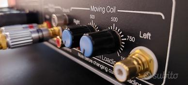 Impostazioni di carico fisse e variabili, controllabili da telecomando: mc configurabile a 60 ohm, 100 ohm, 200 ohm, 47 kohm oppure personalizzabile mediante potenziometro tra 1 e 1000 ohm / mm 47 kohm - 2x ingressi sbilanciati rca indipendenti, 1x mm e 1x mc, con possibilta` di collegamento di 2 bracci / testine