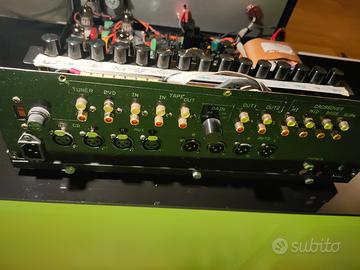 preamplificatore valvolare zero feedback ,senza controreazione con crossover 4 vie attivo come da foto possibile creare un sistema audio attivo senza crossover passivo delle casse e utilizzare un sistema multiamplificazione per collegare le uscite l crossover con I finali per ogni singolo altoparlante 2 o 3 vie. si ha anche una uscita subwoofer.progetto realizzato con dettaglio , trasformatore su misura ,schede come da progetto e componenti di buona qualità. usa delle valvole a scelta 6n2 o 12ax7 con 6922 o 6n1 .come da foto possibile ascolto se non troppo distante.
