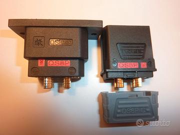 Presa pannello + spina maschio QS8PL antispark, versione ad altissima corrente 130A nominali e 180A max, è possibile saldare facilmente cavi fino a 6AWG (16mmq). Questa versione ha i pin dorati più lunghi del QS8P-S modello standard da 110A nominali e 180A max, il connettore femmina è dotato di condensatore che impedisce il formarsi della scintilla, la scintilla che si crea quando si collega una batteria o alimentatore può danneggiare le apparecchiature elettroniche e col tempo danneggia anche il rivestimento dorato dei contatti.
