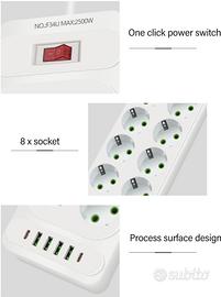 SCHEDA DI ALIMENTAZIONE 14 IN 1 CON USB: presa multipla con 8 prese (massimo 2500 W 10 A) e 4 porte USB A (5 V/ 3,1 A) e 2 porte USB C (5 V 3,1 A), sufficienti per soddisfare le diverse esigenze di utilizzo