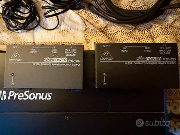 Vendo set completo per home studio / recording, composto da: PreSonus Studio 1824c Interfaccia audio professionale USB‑C con: • 8 preamplificatori di qualità • 2 ingressi frontali Mic/Inst/Line • 48V selezionabile • Uscite multiple per monitor e routing avanzato • Perfetta per produzione, podcast, streaming, band e home studio 2x Behringer MicroPower PS400 Alimentatori phantom power 12V / 48V per microfoni a condensatore. Ultra‑compatti, affidabili, ideali per chi usa microfoni esterni senza phantom integrato. Inclusi • Alimentatori originali • Cavi necessari • Tutto perfettamente funzionante NON VENDO SEPARATAMENTE