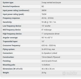 Vendo coppia di casse passive "Proel SMT 153P" da 760 W l'una da come si può evincere nella scheda tecnica allegata nelle fotografie. Il prezzo è riferito alla coppia di casse con inclusi i 2 cavi per collegarle all'amplificatore e i supporti treppiede Proel. E' disponibile anche: