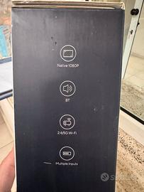 Utilizzato solo per poche ore Risoluzione Nativa: 1920 x 1080 pixel (Full HD 1080p). Supporta anche l'ingresso di contenuti in 4K (che vengono riscalati). • Luminosità: Circa 12.000 Lumen (circa 300-400 ANSI Lumen), ideale per ambienti oscurati. • Rapporto di Contrasto: 10.000:1, per neri più profondi e colori vividi. • Sorgente Luminosa: LED con una durata stimata fino a 30.000 - 50.000 ore di utilizzo. • Dimensione Proiezione: Da 40 pollici fino a 200 pollici. Connettività e Funzioni Smart • Wi-Fi Dual Band: Supporta frequenze a 2.4GHz e 5GHz. Permette il Mirroring Wireless (AirPlay per iOS e Miracast per Android) per proiettare lo schermo dello smartphone senza cavi. • Bluetooth 5.2: Consente di collegare soundbar, casse esterne o cuffie senza fili per un audio migliorato. • Porte Fisiche: • 1x HDMI (per PC, console, Fire Stick, TV Box). • 1x USB (per leggere file da chiavette). • 1x AV (per dispositivi analogici). • 1x Jack Audio 3.5mm (per cuffie o casse cablate). Regolazioni e Audio • Correzione Trapezoidale (Keystone): Manuale (solitamente \pm 15^\circ) per allineare l'immagine se il proiettore non è perfettamente centrato. • Messa a Fuoco: Manuale tramite la rotella posta sopra l'obiettivo. • Audio Integrato: Dotato di doppi altoparlanti Hi-Fi integrati. • Zoom: Funzione di zoom digitale (solitamente dal 75% al 100%) per regolare la dimensione dell'immagine senza spostare fisicamente il proiettore.