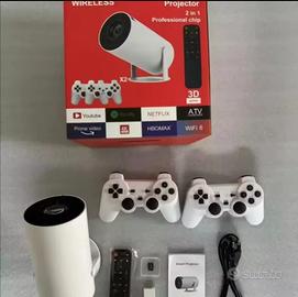 OpenGL/Vulkan. Ingressi HDMI/USB, uscita audio 3.5mm. Riproduce video, foto e musica in vari formati. Kit completo con proiettore, telecomando, 2 controller wireless, cavo e manuale.