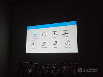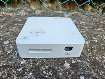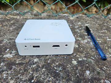 EZCast Beam J2 è un mini proiettore portatile (veramente piccolo) che utilizza la più recente tecnologia DLP (immagini più nitide e definite) a 300 lumen e combina interfacce HDMI, USB e Wi-Fi per supportare il mirroring dello schermo. È compatibile con gli standard EZCast, AirPlay, Chromecast, Miracast e DLNA per proiettare senza fili da dispositivi Android, iPhone, iPad, Windows, Chrome OS. Ha inoltre ingresso HDMI, USB e cuffie e dispone della correzione del trapezio automatica. Incorpora tre batterie al litio da 3000 mAh per almeno 2 ore di riproduzione continua.