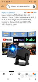 Proiettore in HD risoluzione: questo videoproiettore smart impiega una risoluzione nativa HD, per offrire immagini nitide e precise nel sistema home cinema e nelle attività di svago. Rotazione di 180° regolabile: il proiettore video presenta una proiezione ruotabile di 180° insieme a una funzione di zoom dal 50% al 100%. Le misure della proiezione sono adattabili da 35 a 240 pollici, assicurando risultati visivi eccellenti in svariati contesti. Tecnologia WiFi 6 e Bluetooth 5.4 di Ultima Generazione: questo piccolo proiettore mobile è dotato di supporto per WiFi6 2.4/5G e BT 5.0, per un collegamento rapido a cellulari, laptop e altri gadget, garantendo un'esperienza audio-visiva rapida e senza intoppi. Correzione trapezoidale e funzione di messa a fuoco: il proiettore include la correzione trapezoidale verticale automatica e la regolazione manuale della messa a fuoco, permettendo di adattare l'immagine con semplicità in ogni situazione per una proiezione impeccabile. Connessioni input-output di livello premium: include interfacce USB, HDMI e molteplici porte audio, con ampia compatibilità per l'attacco di diversi dispositivi. Gli altoparlanti hi-fi da 1x3W, con un rumore al di sotto dei 25 dB, assicurano un'esperienza d'uso silenziosa e confortevole.Immergiti nell'esperienza
