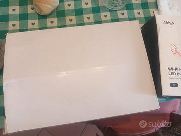 mini proiettore comodissimo, si associa al telefono e si possono vedere film da Netflix Disney prime video, qualsiasi trasmissione in quanto proietta sul proprio telo bianco che dei ganci e delle corde molto lunghe per essere attaccato ovunque. Vendo causa doppio pezzo simile che non utilizzo.