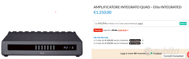 Vendo per inutilizzo, corredato di scatola originale, telecomando e cavo quadlink per collegarlo alla serie Quad Elite e vecchia serie. Attualmente a listino. Simile a Rega Audiolab, Naim, Primare, Copland, Meridian, Musical Fidelity. Amplificatore integrato 2 x 80WRMS Ω – sens. ingr. 760mV – ingressi: 2xline, tape in – uscite: 1xpre out, tape out – risp. freq. 20Hz÷20kHz+0dB/-3dB – THD 0,05% – S/N 75dB (A pesato) – telec. – mm (hxlxp)70x321x310 – peso 6,6 kg