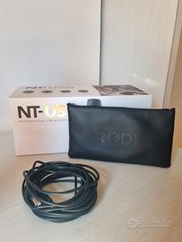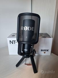 Microfono RØDE NT-USB, dotato di filtro Anti-pop, aggancio per asta microfonica regolabile, treppiede, custodia e cavo USB da 6 metri. Molto versatile, registra il parlato, cantato e anche strumenti musicali. Come nuovo, usato pochissimo.