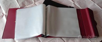 Raccoglitore, archivio, album porta dischi con custodia alto 35,5 cm, largo 12 cm, profondo 37,5 cm, con 12 buste per raccoglitore misure, base 33 x 34 cm. Raccoglitore dorso 6cm, materiale cartonato rivestito rigido in similpelle fuori nero dentro amaranto serigrafie in simile oro, usato poco, tenuto in luogo asciutto e al riparo dal sole e dal calore.