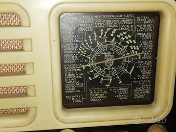 Rara radio d'epoca philips Bi280a prodotta negli stabilimenti di Monza nel 1946. Apparecchio in bakelite bicolore integro, conservato ottimamente, niente crepe, decolorazioni, rotture. La radio si accende regolarmente ma non modo di verificarne il corretto funzionamento. Per collezione o esposizione