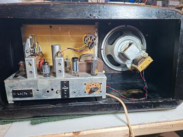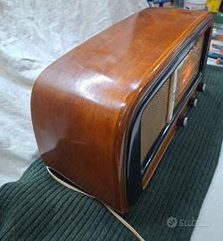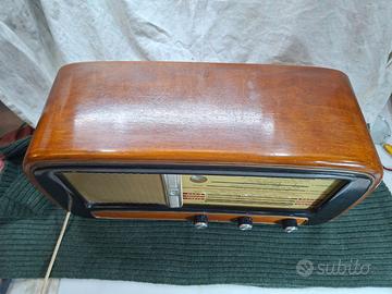 Radio a valvole marca Radiomarelli modello RD 148 (anno di produzione 1955, serie ANIE, tensione 220 v). La parte elettrica è stata revisionata (sostituiti alcuni condensatori). Telaio in condizioni complessive molto buone. La scala parlante e la tela sono integre e originali. Manopole sostituite. La radio si accende, il potenziometro volume varia la potenza in uscita, ma si sentono solo fruscii, pertanto viene venduta come “non funzionante”. Misure cm 48x27x21 (LxAxP). Ritiro a mano a Roma e dintorni (o spedibile). L'imballaggio verrà preparato con la massima cura per prevenire danni da urti o cadute. VENDITA DA PRIVATO - SENZA GARANZIA- CON FORMULA “VISTO E PIACIUTO” NELLO STATO IN CUI SI TROVA.