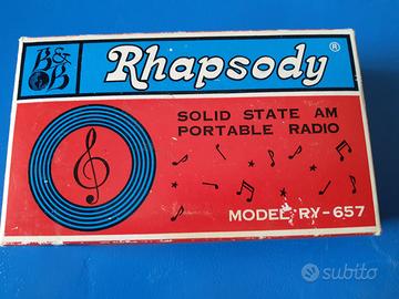 Vendo Radio AM RHAPSODY MOD. RY-657 a batterie, completa di scatola originale, auricolare, perfettamente funzionante. Oggetto usato, acquistato nel 1977 negli USA, non in garanzia. €30,00 Chiamare a Voce (NO WHATSAPP) al numero 351-0373465 solo se veramente interessati, dalle ore 18:30 alle ore 20:30 tutti i giorni escluso la domenica e i festivi.
