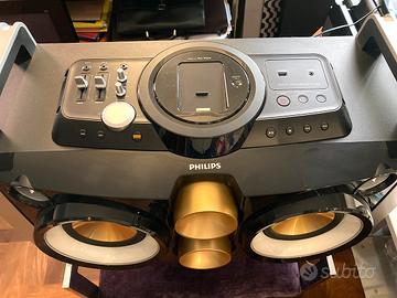 Boom Box o Party Machine di grande impatto estetico e perfettamente funzionante. Praticamente nuova con poche ore di utilizzo e sempre tenuta in scatola. Radio FM integrata ed ingresso per iPod o iPhone (non so fino a quale modello iPhone). Ingresso USB per ascoltare direttamente da chiavetta ed ingresso mini jack.