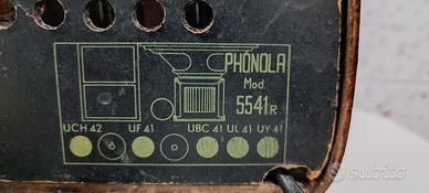 Per gli amanti del collezionismo radio d'epoca, vendo una Radio a valvole PHONOLA modello 5541R Serie Anie Phonola SA, FIMI; Saronno (VA) funzionante perfettamente. Frequenze Onde Medie-Onde Corte. Alimentazione a corrente alternata (CA) / 125; 140; 160; 220 Volt. Altoparlante AP magnetodinamico. Radio completa ed originale. 5 Valvole, condizioni buone. Epoca 1950/51. Dimensioni: (29x15x20)cm.