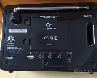 Radio digitale (DAB/DAB+), FM, Internet (WiFi o Ethernet). Bluetooth. Altoparlante full range 3.5". Display grafico Oled bianco e nero. Alimentazione di rete. La radio è fornita già di Pure Charge Pak originale, manuale, WiFi su USB. Dimensioni 209x110x175 (lxpxh).