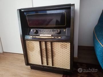 VINTAGE ANNI 50/60 " GRUNDIG ". Mobile radio vintage degli anni 50/60 a valvole e occhio magico OM, OC, FM. Modello 7061W / J / Mit 3-D- Effekt. Attualizzato con lettore CD, DVD. Dimensioni: altezza cm 83 larghezza cm 62,5 profondità cm 42. il piano è un po' rovinato. RADIO PERFETTAMENTE FUNZIONANTE!