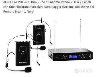 AUNA Pro VHF-400 Duo 2 - Set 2 Radiomicrofono VHF a 2 Canali con Due Microfoni Auricolari, 50m Raggio d'Azione, Riduzione del Rumore Interno, Nero