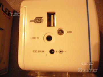 puo fungere da radio o cassa x pc. con collegamento usb e sd card. fa anche da torcia e speaker. aux-in x collegare altri dispositivi. si spedizione