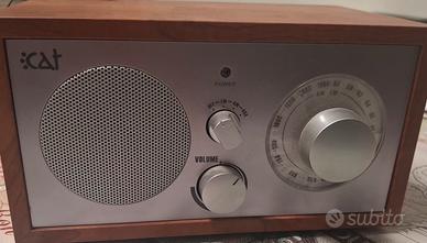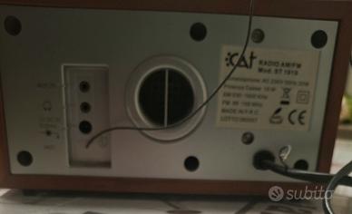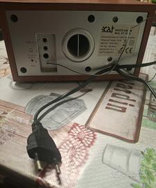 radio retrò con finitura in legno e dettagli in argento. altoparlante rotondo. manopole per volume e selezione frequenze. indicatore di potenza. selettore modalità: OFF-FM-AM-AUX marca CAT colore marrone