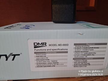 Vendo bellissima radio portatile TYT MD 680D DMR analogica e digitale, usata praticamente niente pertanto la batteria è come nuova. La radio è una UHF. La radio è in condizioni da vetrina, perfettamente funzionante, mai caduta e non ha mai visto acqua o neve. La vendo con la sua scatola e gli imballi originali.