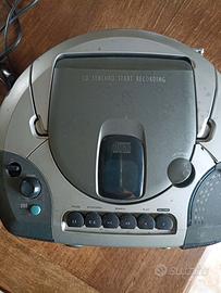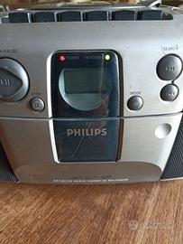 Vendo radioregistratore portatile Philips AZ1101 (boombox) usato funzionante.Riproduce CD,radio FM/MW e cassette,con registratore,display LCD centrale,ingresso audio jack da 3,5 mm.,antenna telescopica e cavo di alimentazione.Dispone di un sistema Dynamic Bass Boost (DBB) per enfatizzare le frequenze basse.Alimentazione tramite cavo di rete o batterie (8 x 1,5 V).
