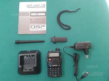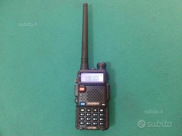 Display alfanumerico con retroilluminazione in 3 colori indicante le due frequenze di banda VHF e UHF a caratteri maggiorati. Antenna bibanda in dotazione.