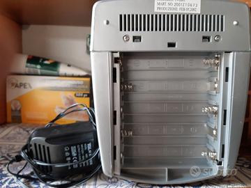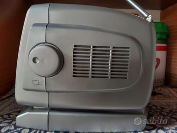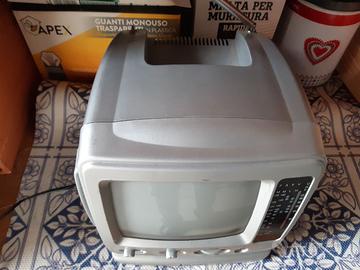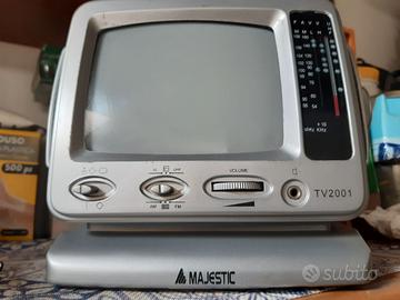 Vendo mini TV con radio incorporata. Marca Majestic, modello TV 2001, portatile dotata di schermo tv a tubo catodico da 5" e radio analogica a doppia frequenza AM e FM. Antenna stilo e maniglia. Doppia alimentazione: 12V con 6 mezze torce da 1,5V e corrente 220V con trasformatore (in dotazione). Colore grigio argento. Ottime condizioni. Funzionante la radio, il TV purtroppo no mancando il decoder DTT.