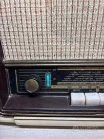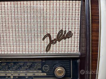 Per appassionati di vintage: stupenda radio CGE Jolie, modello anni '50 (circa 1957), icona del design italiano! Cabinet in legno massiccio (mogano e avorio) con finitura originale, diffusore a griglia e scala sintonizzatrice con bande per OM, FM e corti – sintonizzati su Roma, Milano, Madrid, Parigi e Londra come ai vecchi tempi!