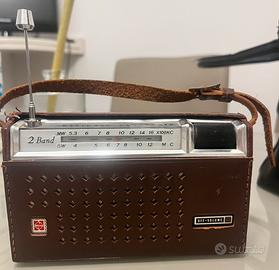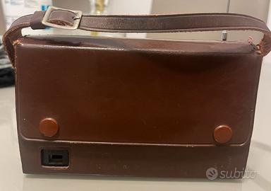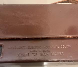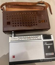 Radio Vintage National Panasonic R-807H a 2 bande con 8 transistor, prodotta in Giappone negli anni ‘60. Ricevitore radio a transistor. Corpo in plastica con griglia metallica e custodia protettiva in pelle marrone.
