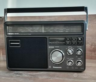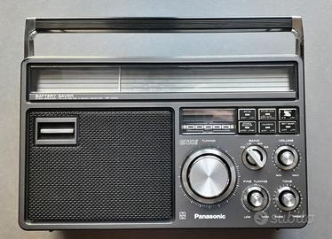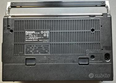 Radio a transistors portatile del 1980, marchiata Panasonic e prodotta a Singapore dalla Matsushita Electric. Ricevitore a 4 bande. FM - UKW: 87.5 – 108 MHz. ● LW: 150 – 285 kHz. ● MW: 520 – 1610 kHz. ● SW - KW: 5.9 – 18.0 MHz. VU-Meter a 5 led (rossi) per indicare qualità sintonia/carica batterie. 2 prese laterali: mini jack 3,5 mm per auricolare mono e Din a 5 poli per giradischi/cassetta (foto 3). Alimentazione: rete con cambiatensione da 110-125 a 220-240 Volt oppure 5 batterie torcia da 1,5 Volt “D”. Mobile in plastica nero con frontale grigio, griglia altoparlante nera in metallo, fascia superiore e laterale in alluminio. Altoparlante a 2 vie. Dimensioni: cm 29 x 23 (h con maniglia alzata) x 8 (profondità). Peso: 1.976 g. L’apparecchio è perfettamente funzionante. I contatti nel vano pile non sono ossidati, l’antenna telescopica originale è integra. In zona, posso naturalmente scambiare a mano.