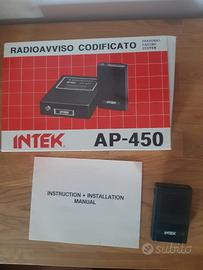 Radioavviso codificato Intek AP-450, collegato ad un allarme a 12v per esempio in macchina, in caso di evento fa suonare il piccolo ricevitore portatile utile per venire avvisati se suona l'allarme della macchina se siete a casa oppure dentro un negozio o al mare e vi stanno rubando la macchina o l'autoradio. Si collega all'antenna CB della macchina. Inclusa scatola e libretto di istruzioni. Spedizione 10 beuro.