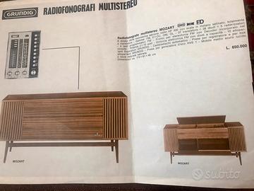 Radiofonografo multistereo dotato di radio HF500 con scala in metallo satinato, totalmente a transistor. Pronto per stereofonia FM con Decoder incorporato nel circuito. Potenza 2 x15 Watt; 10 altoparlanti superphon Grundig; cambiadischi automatico; prese per registratore e per box altoparlanti ; presa per generatore d’eco HVS1. Dimensioni mobile: 174x81x46cm