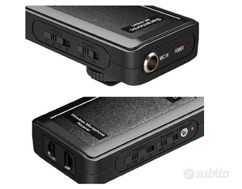 Quattro canali selezionabili per evitare interferenze. – Antenna flessibile e rimovibile, può essere ruotata a 360° in base al suono migliore. – La banda alta VHF offre un suono puro – Si può registrare l’audio fino a 60 metri di distanza senza ostacoli – Monitor in tempo reale – Manopola del controllo del volume – Indicatore LED indica la durata della batteria – Alimentazione tramite batterie AAA – Include un trasmettitore da cintura, ricevitore da montare su fotocamera e un microfono lavalier omnidirezionale.