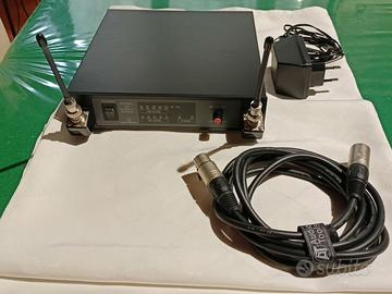 microfono headset, radio trasmettittore con gancio per fissarlo agli abiti, radio ricevitore con doppia antenna, cavo bilanciato, adattatore 12v.