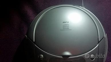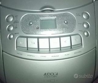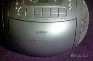 Radioregistratore cd anche mp3 stereo Audiola funzionante a 230v con cavo riponibile in apposito vano o con 8 batterie mezza torcia (non fornite)antenna telescopica e maniglia x trasporto ripiegabile misure ca. L27 x p29 x h15 cm