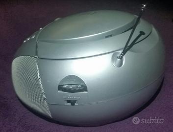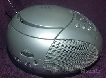 Radioregistratore cd anche mp3 stereo Audiola funzionante a 230v con cavo riponibile in apposito vano o con 8 batterie mezza torcia (non fornite)antenna telescopica e maniglia x trasporto ripiegabile misure ca. L27 x p29 x h15 cm