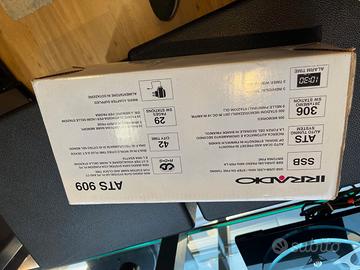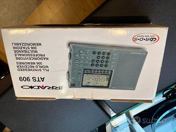 IRRADIO ATS 909 Il ricevitore IRRADIO ATS 909 è uno dei più famosi ricevitori per Onde Lunge, Onde Medie ed Onde Corte; non manca quasi mai nel corredo del BCL e dell'SWL (e di molti radioamatori) essendo in grado di demodulare AM, FM (mono e stereo), USB, LSB, CW. Le principali caratteristiche sono: - AM/FM STEREO/SW - CONTINUOUS TUNING, ALL BANDS - TRUE SINGLE SIDE BAND RECEPTION WITH FINE TUNING - AUTO SEARCH - FULL RDS RECEPTION - 5 TUNING METHODS - AUTO TUNE SYSTEM - ALPHA NUMERIC EDITING - RF GAIN CONTROL - WIDE/NARROW FILTER - SELECTABLE MANUAL TUNE STEPS - DUAL TIME SYSTEM - 3 INDIVIDUAL TIMERS - ADJUSTABLE SLEEP TIMER - DUAL CONVERSION RECEIVER - FAVORITE STATION RECALL BUTTON - BATTERY & SIGNAL STRENGTH INDICATOR - TONE CONTROL - 306 MEMORIES - DAYLIGHT SAVINGS TIME SWITCH - ILLUMINATED LCD DISPLAY - 42 WORLD CITY TIMES BUILT-IN - ALARM BY RADIO OR BUZZER - 261 WORLDS FAVORITE STATIONS ALREADY PROGRAMMED - WIDE/NARROW FILTER - INCLUDES CARRYING CASE,AC ADAPTER & ANT-60 SW REEL ANTENNA - SIZE:8.5x5.25x1.5 - WEIGHT:30oz.