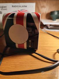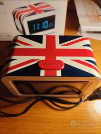 radiosveglia Bigben Sound con design a bandiera inglese. La radio FM offre suono chiaro e nitido. Dotata di funzione snooze e display digitale luminoso. Alimentazione a rete elettrica e/o batteria DC 9V. Usata poco e in ottime condizioni, funzionante.