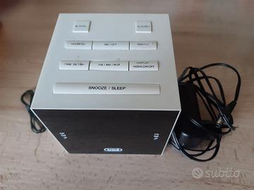 Radio AM FM con antenna a filo, orologio e doppia sveglia.
